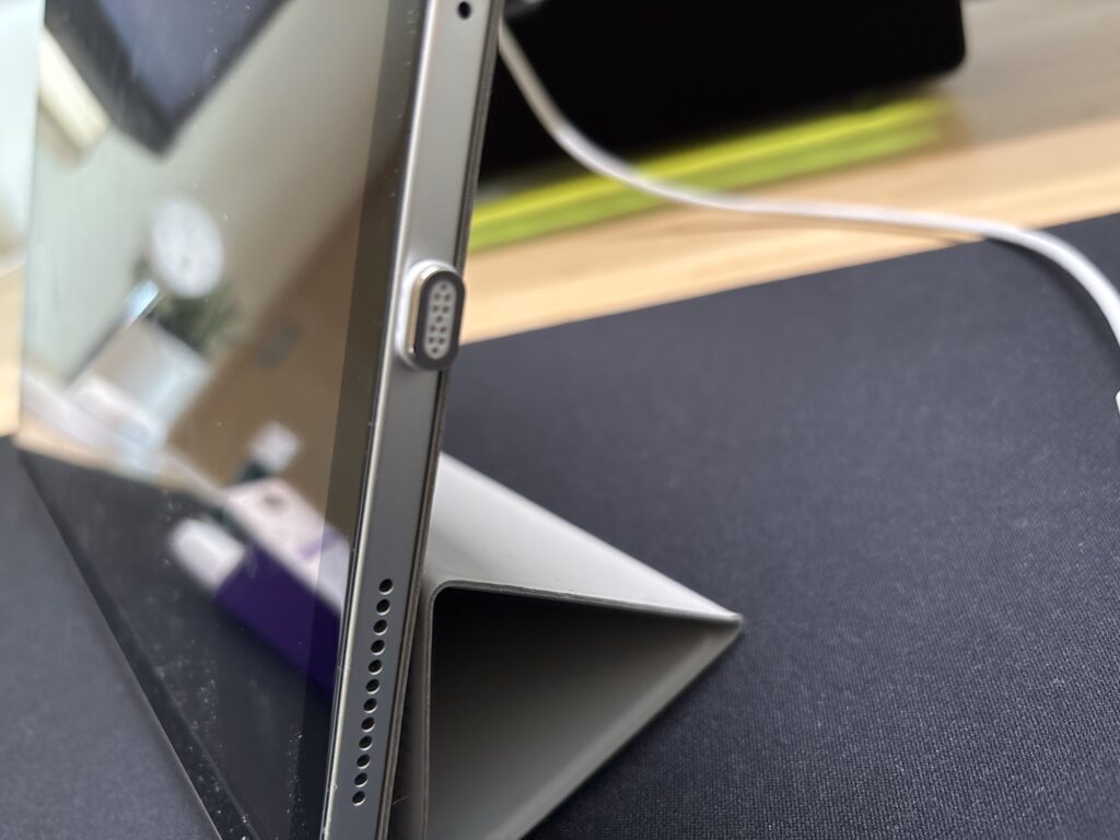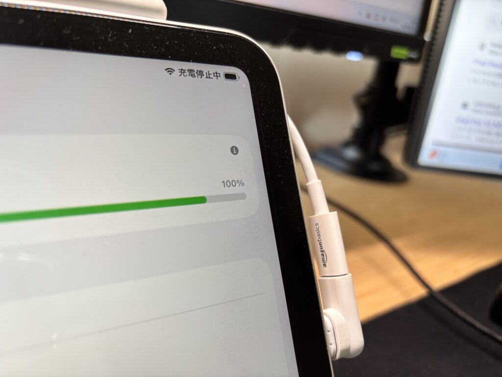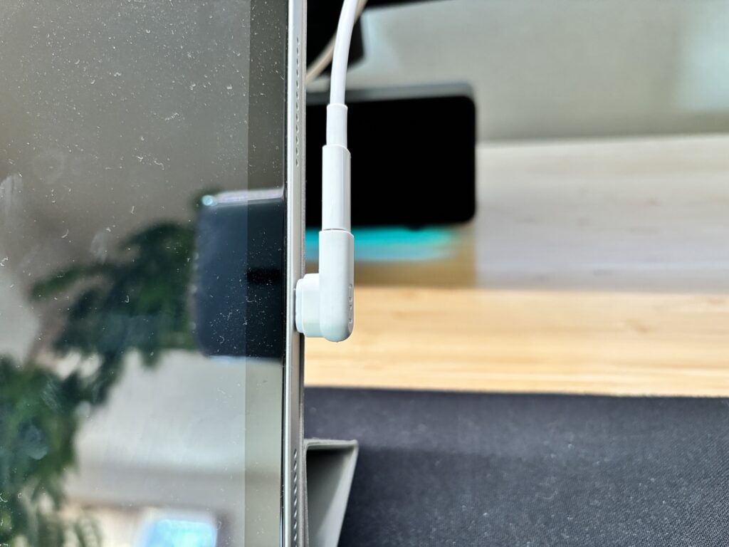 今までは、充電ケーブルを抜くという動作が面倒で、充電中のiPadを放置しがちでした。でも今は、横に「ピッと」倒すだけで外れるので、使いたい時に一瞬で手に取れます。