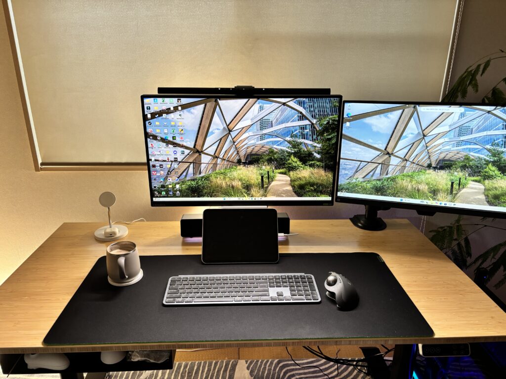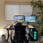 FLEXISPOTのE8の竹天板140x70をベースにデュアルモニターにWindowsのゲーミングPCをホイール付きのPCラックに置いています。