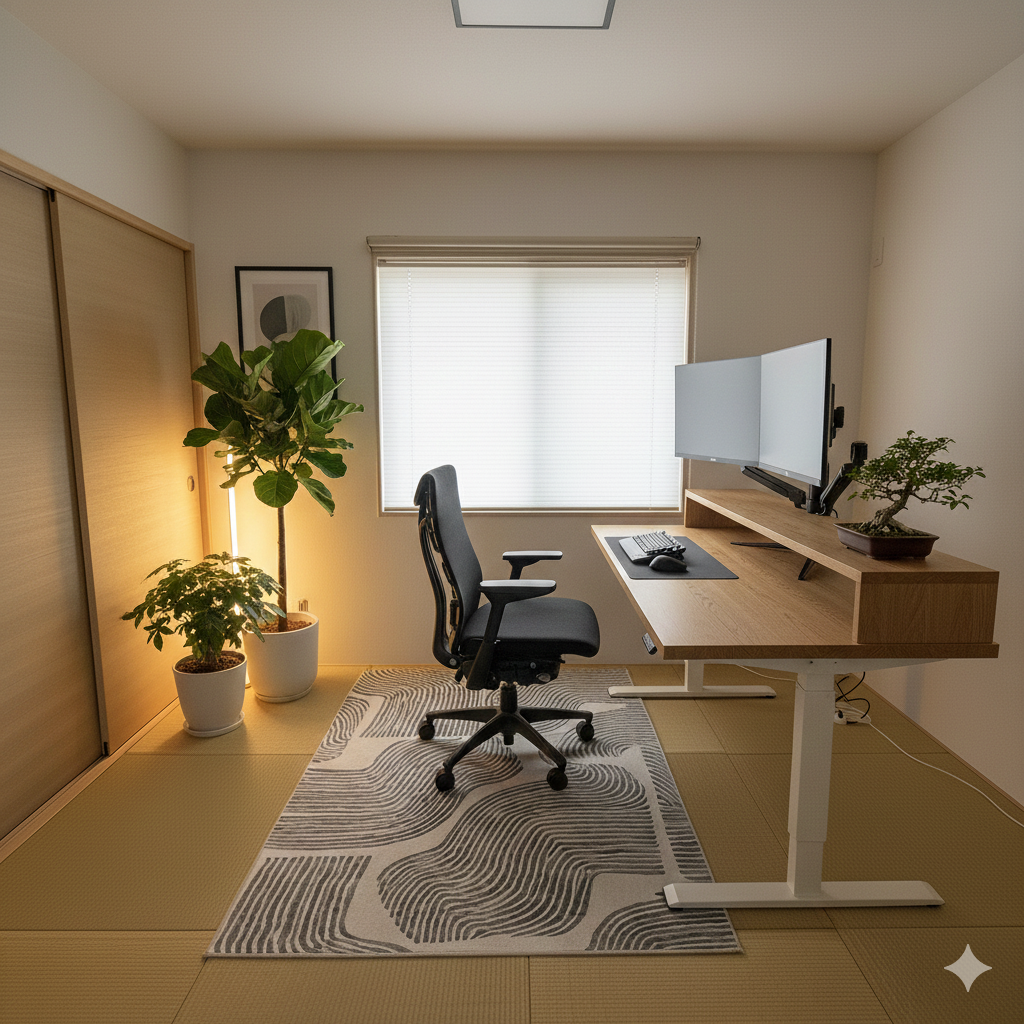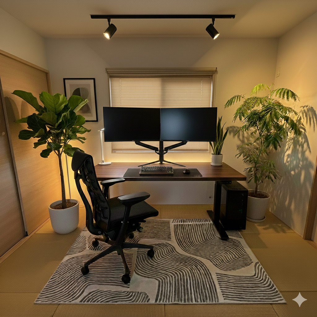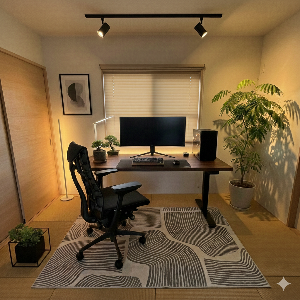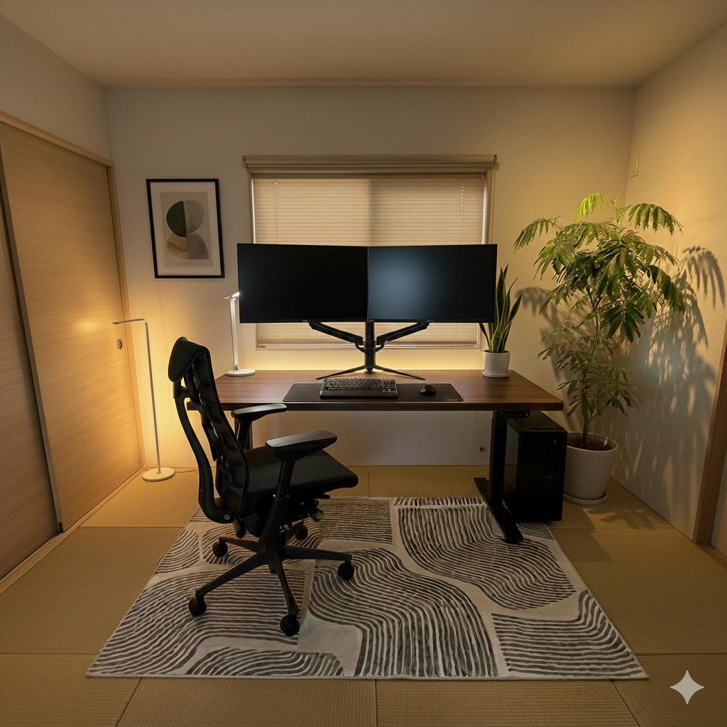 さすがに畳に直にチェアとデスクを置くわけにいかず、フレキシスポットの公式で売っていたラグをひとまず取り入れました。