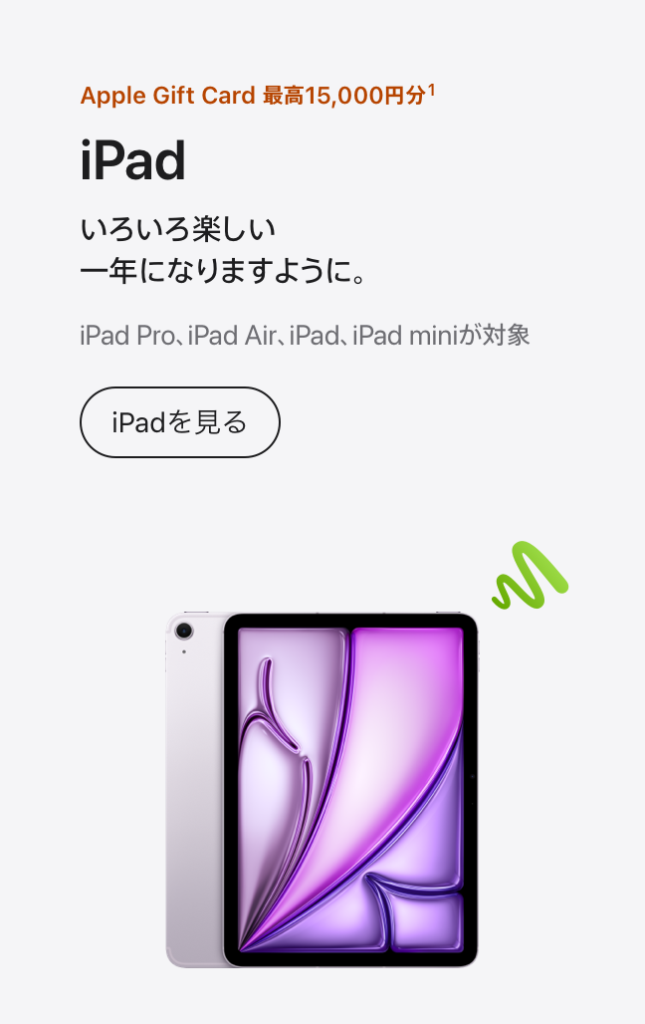iPad Airは、ギフトカードでApple Pencil Pro(初売り対象:4,000円還元)を安く買うという「合わせ技」が使えます。