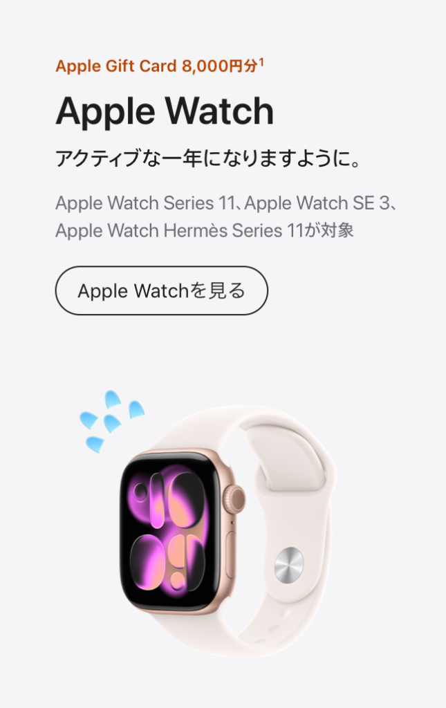 新型のWatch SE 3は、元値が安いため還元率が20%を超えます。スマートウォッチデビューにこれ以上のタイミングはありません。もちろん最新のWatch Series 11を8000円お得に購入するのもアリ。